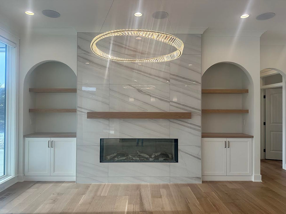 These photos show a sampling of the quality woods, finishes, cabinet styles and various design features utilized by Higgins Custom Cabinetry. As you review the pictures notice the extra custom features such as: corbels, pocket doors, TV frames / panels, speaker doors, glass doors, wood tops, floating shelves, extra crown layers and wood tops.