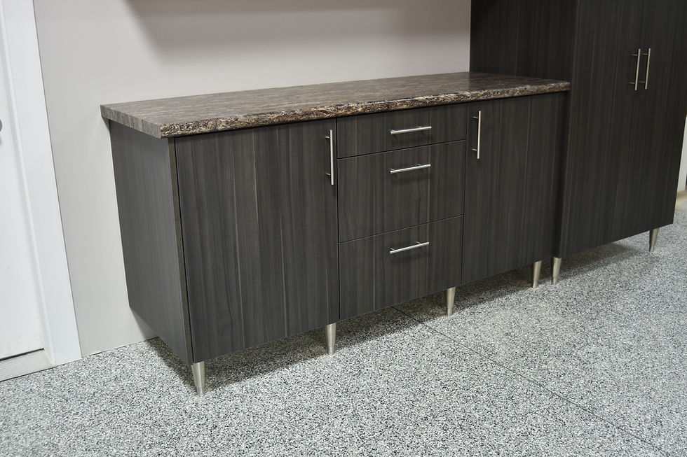 These photos show a sampling of the quality melamine, finishes, some cabinet styles and various design features utilized by Higgins Custom Cabinetry. As you review the pictures notice the custom hardware and counter top features.